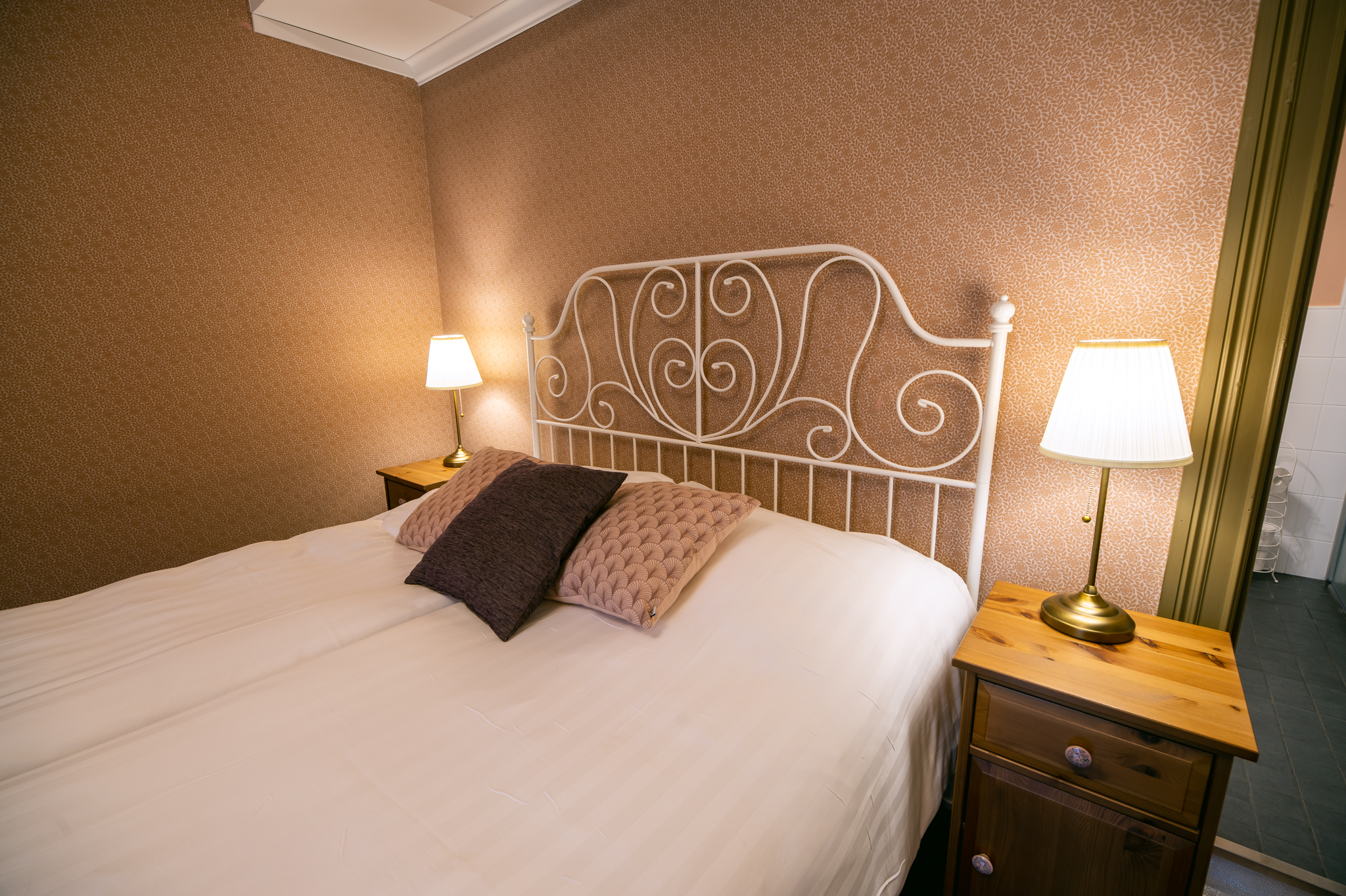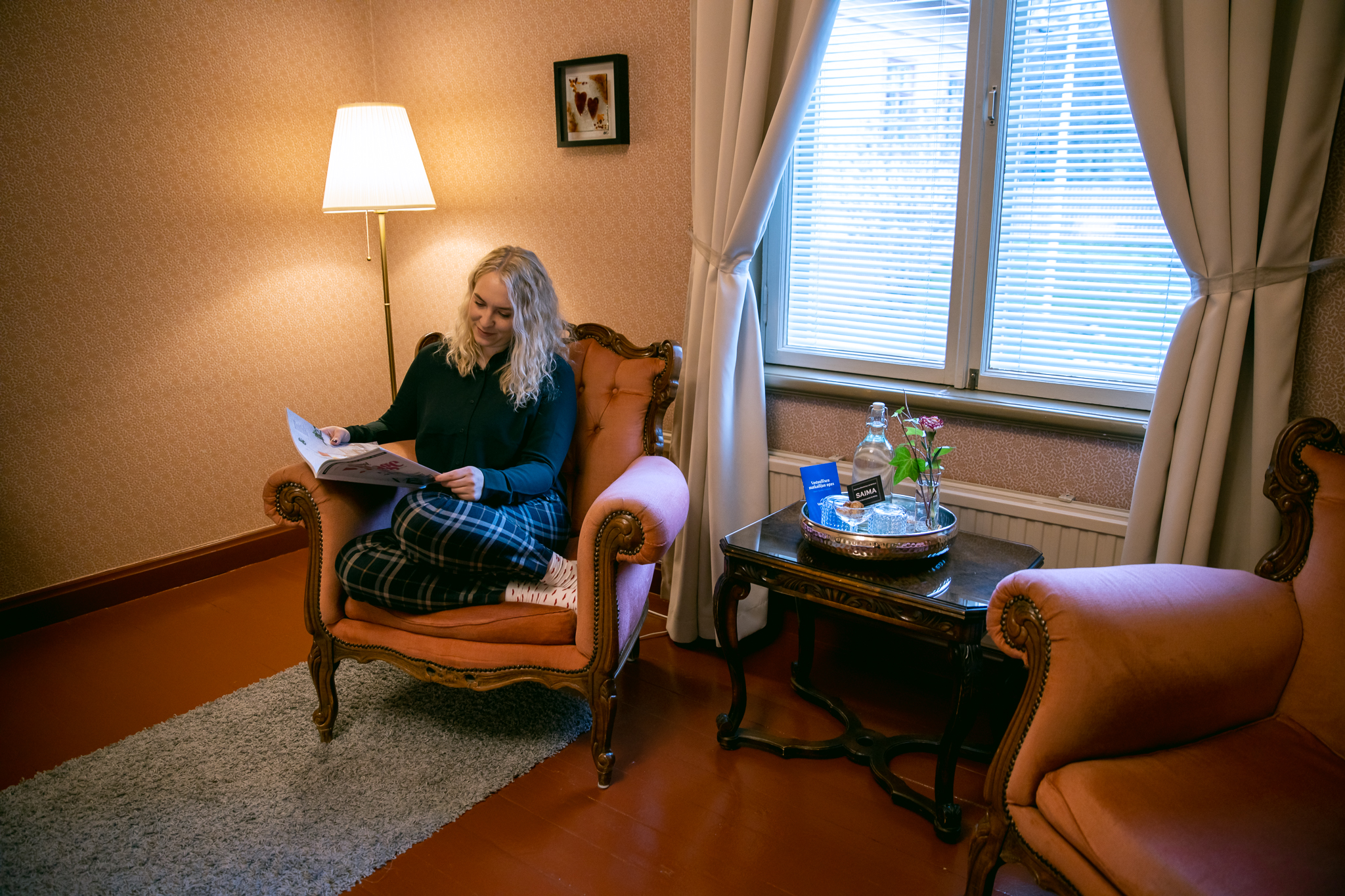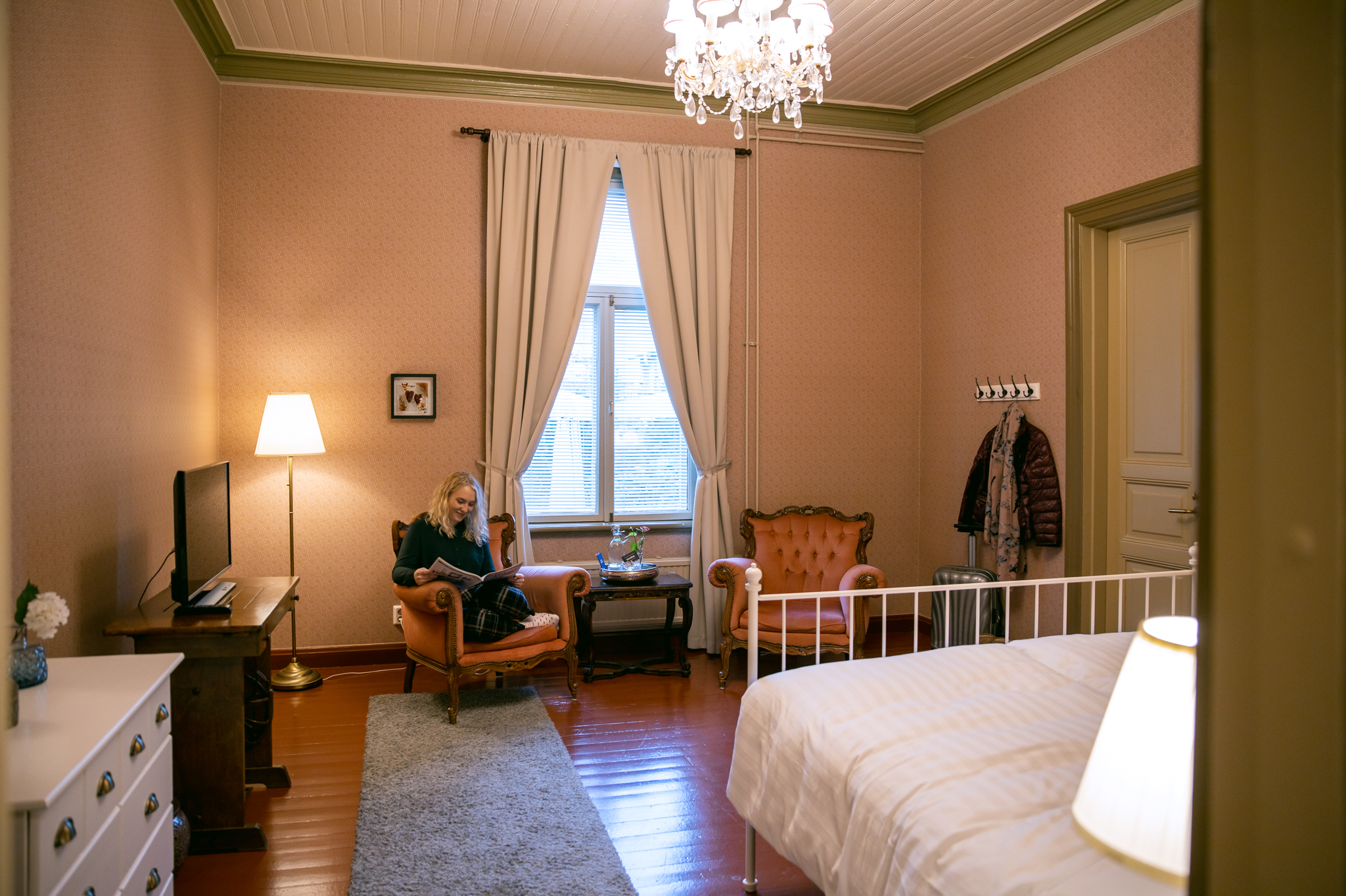 Tämä ihastuttava huone sijaitsee hotellin alakerrassa ja sen suuresta ikkunasta on näkymä Saima Talon puutarhaterassille. Huoneen seiniä koristaa perinteinen vaaleanpunainen kukkakuvioinen paperitapetti, joka yhdessä korkean huonekorkeuden kanssa luo nostalgisen tunnelman tähän avaraan huoneeseen.
